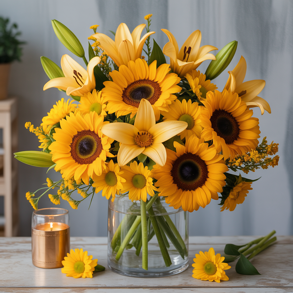Bright sunflowers, golden lilies, and cheerful daisies arranged to bring warmth and joy to any space. A celebration of life and happiness.