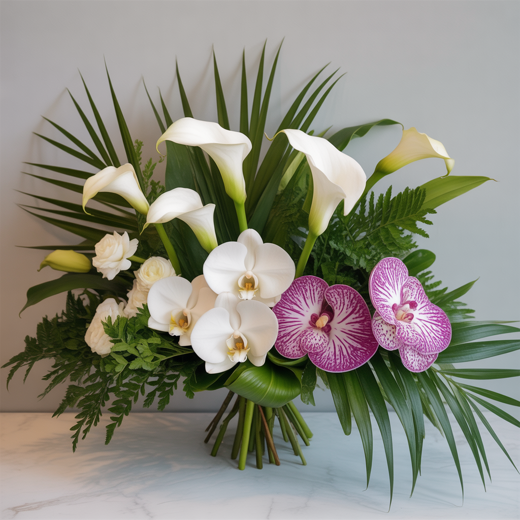 An sophisticated arrangement featuring orchids, calla lilies, and exotic foliage. Ideal for upscale events and making a memorable impression.